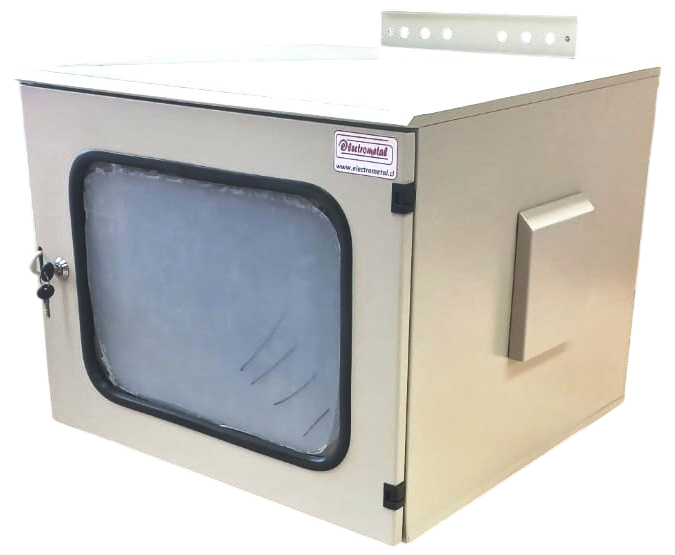 Rack Exterior Galvanizado 9 UR x 19″ x Prof 600mm Muro/Poste, Incluye 1 Ventilador 220vac y Termostato Visor